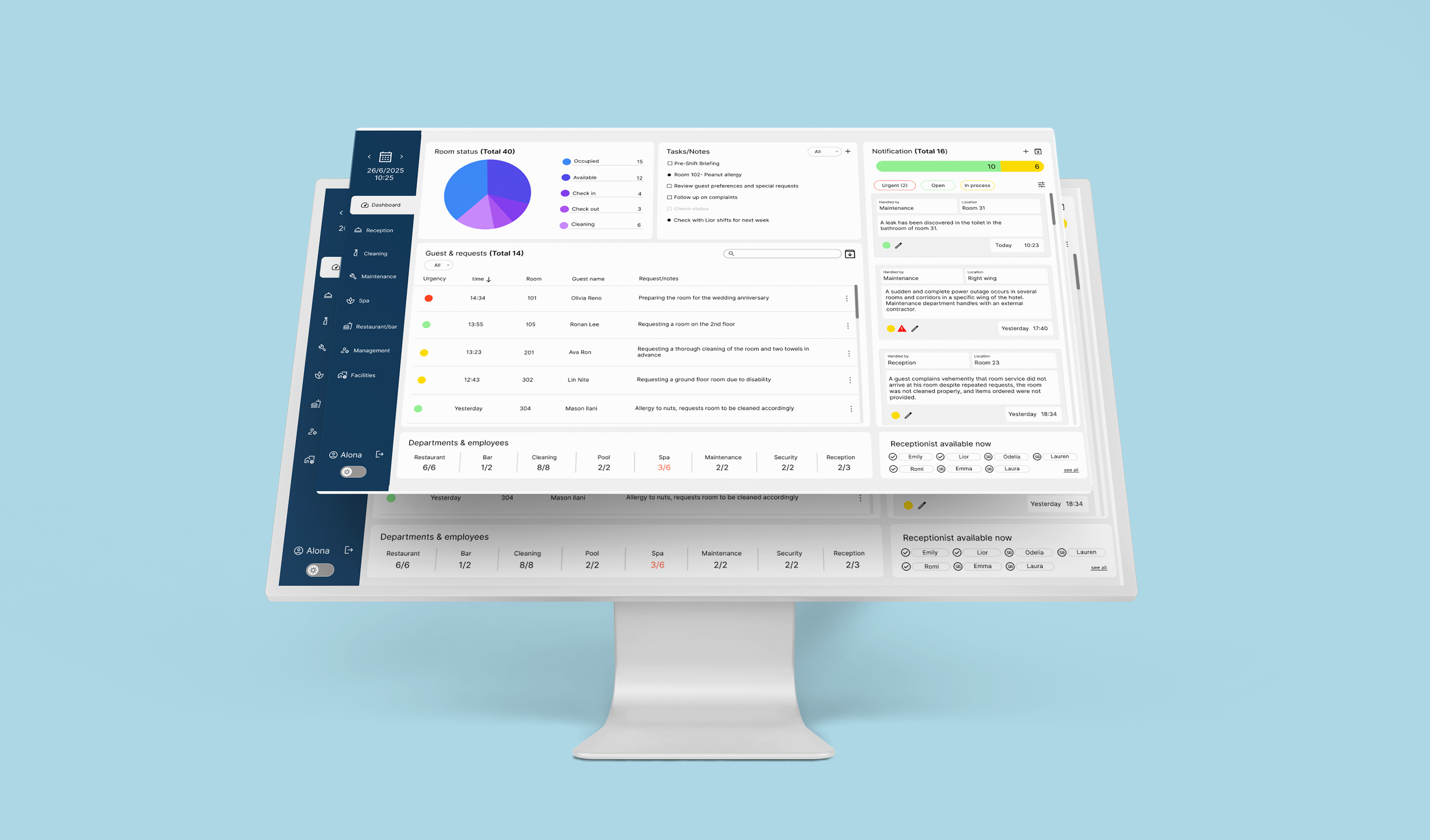 The dashboard streamlines hotel operations, enabling faster responses, greater efficiency, and easier onboarding through a clear, intuitive, and professional design.